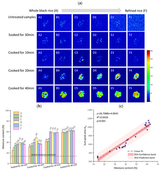 Changes in water distribution (a) of black rice with different milling degrees (A: 0%, B: 0.57%, C: 1.27%, D: 4.16%, E: 6.97%, F: 10.19%) under different stages (untreated samples (A1–F1), soaked for 30 min (A2–F2), and cooked for 10 min (A3–F3), 20 min (A4–F4), 40 min (A5–F5)), moisture content (b), correlation analysis of moisture content and sum peak area A2i (c). In the bar graph, different superscript lower case letters in the bar graph indicated statistically significant differences between different black rice groups at the same soaked or cooked periods (p < 0.05), while different superscript upper case letters indicated statistically significant differences between different soaked or cooked periods in the same black rice group (p < 0.05).