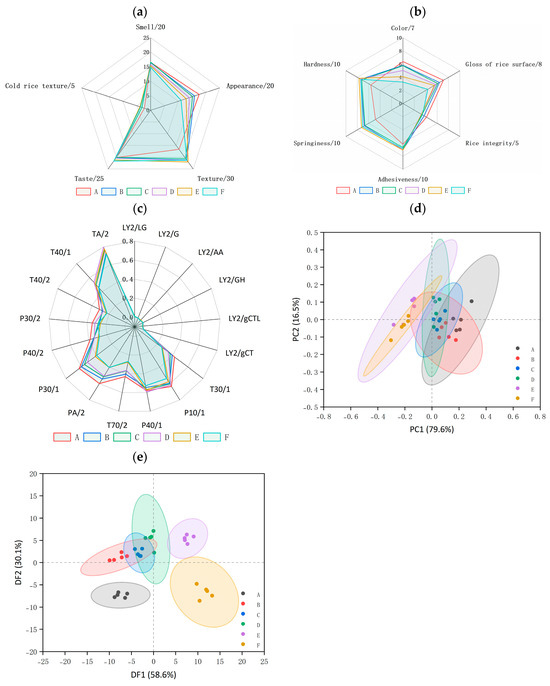 Radar map of primary descriptive attributes (a) (smell, appearance, texture, taste, cold rice texture) and secondary attributes (b) of appearance (including color, gloss of rice, rice integrity) and texture (including adhesiveness, springiness, hardness) of black rice with different milling degrees; Radar map of response value of 17 sensors (c); Principal component score plot (d) and corresponding discriminant function score plot (e).
