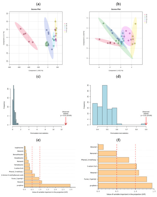 PLS-DA score plot based on volatiles content (a) and OAV (b), permutation test by PLS-DA based on volatile odor content (c) and OAV (d), value of variable importance in the projection (VIP) of variables by PLS-DA of volatiles identified in cooked black rice samples based on volatile odor content (e) and OAV (f).