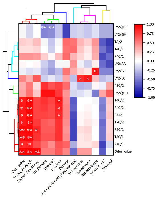 Heat map of hierarchical cluster analysis of Pearson correlation coefficient between odor value (smell score in sensory test) and response value of sensors in electronic noses or relative concentration of volatiles (* p < 0.05; ** p < 0.01).