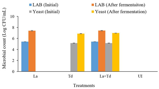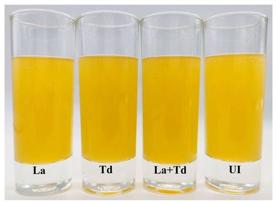 The effects of La and Td on the physicochemical properties of fermented and unfermented JA juice samples are presented in Table 2. Color is one of the most important food parameters, as it can significantly influence consumer acceptability [48]. In this study, all color parameters significantly changed after fermentation (p < 0.05). The lightness (L*) parameter decreased, while the redness (a*), yellowness (b*), chroma (C*), hue angle (H*), and total color difference (∆E*) parameters increased after fermentation. Total color difference is commonly used as a color quality parameter as it can quantify the magnitude of color differences between treatments and control samples after 24 h of incubation. In this case, it was employed to quantify the magnitude of color in the JA juices before fermentation. According to Wibowo et al. [49], perceivable color differences can be analytically classified as not noticeable (0–0.5), slightly noticeable (0.5–1.5), noticeable (1.5–3.0), well visible (3.0–6.0), and significant (>6.0). After fermentation, the ∆E* values were 0.06, 3.29, 2.99, and 2.18 in the uninoculated, La, Td, and La + Td inoculated JA juices, respectively. The most distinct color difference, classified as well visible, occurred when the juice was fermented with La. The color differences in the JA juices fermented with Td and a mixed culture of La and Td fell into the noticeable classification, while the uninoculated JA juice exhibited no perceptible change. This result indicates that the color differences in the fermented JA juice can be visually distinguished.