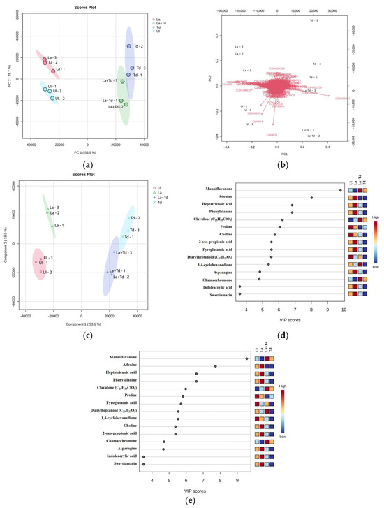 PLS-DA effectively eliminated noise and identified the most relevant metabolites for distinguishing between groups [72]. According to the PLS-DA score plot, the La-inoculated JA samples were completely separated from the other fermentation samples (Td- and La + Td-inoculated), while the Td- and La + Td-inoculated samples had less of an overlap when compared with the PCA results. This observation indicated that the main metabolites in the La-inoculated samples differed from those in the Td- and La + Td-inoculated samples, which shared similar main flavor characteristics. Metabolite discriminant variables contributing to the PLS-DA model were ranked along with the variable importance in the projection (VIP) scores. Based on the VIP scores (≥1.0), the higher the VIP scores of the metabolites, the more significant their contribution to the differences between groups [20]. The top 15 metabolites that strongly contributed to the variations included manniflavanone, adenine, heptatrienoic acid, phenylalanine, clavulone, proline, choline, 2-oxo-propionic acid, pyroglutamic acid, diarylheptanoid, 1,4-cyclohexanedione, asparagine, chamaechromone, indoleacrylic acid, and swertiamarin (Figure 3d,e). These results correlate with the PCA biplot, which indicates that manniflavanone serves as a significant discriminant between two clusters: JA juice samples with and without Td- inoculation.