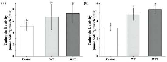 The activity of cathepsin B (a) and cathepsin L (b) of shrimp muscle from the control group, the mimicked water transportation (WT) group, and the mimicked water-free transportation (WFT) group. Values are presented as the mean ± SD; different letters indicate that significant differences exist (p ≤ 0.05).