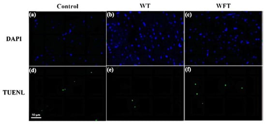 No significant changes in cathepsin B activity were observed in the WT group compared to the WFT and the control groups (p > 0.05, Figure 2a). As shown in Figure 2a,b, both cathepsin B and L activities in WFT showed a significant increase compared to the control group (p ≤ 0.05). Conversely, the cathepsin L activity in the WT group showed a significant increase compared to the control group (p ≤ 0.05, Figure 2b).
