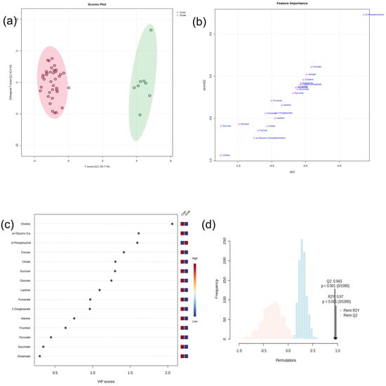 OPLS-DA model for metabolic profiles in yoghurt samples from cow milk (CY) versus goat milk (GY). (a) Score plot, (b) S-plot, (c) VIP plot, and (d) permutation test plots of the OPLS-DA model.