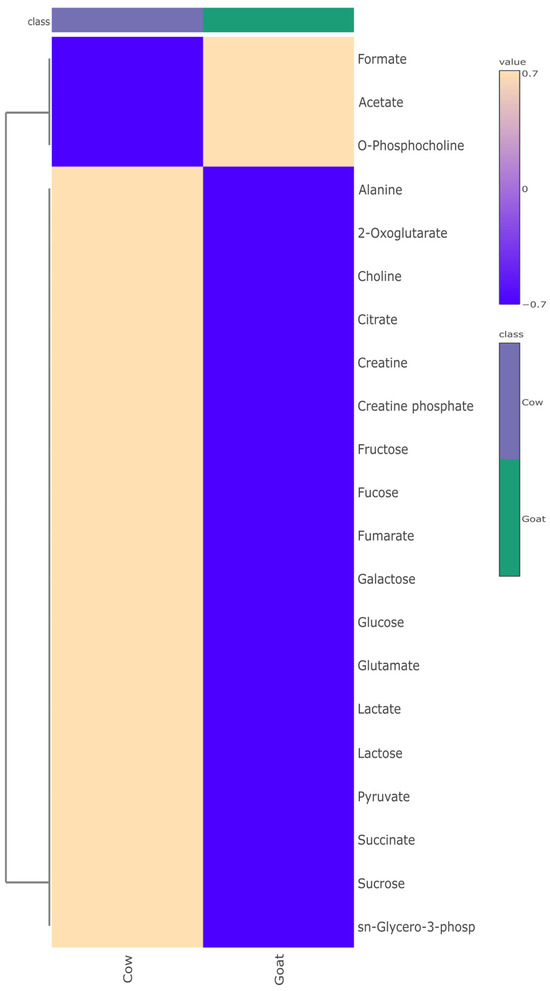 Hierarchical clustered heat map of the metabolite levels in samples of cow milk yoghurt vs. goat milk yoghurt.