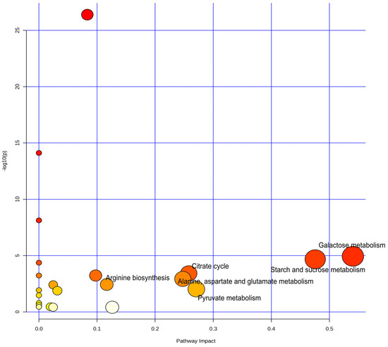 The process of converting lactose in milk into lactic acid by the starter culture is complex and involves numerous reactions that result in several intermediates in metabolic pathways. These pathways reduce the pH and bring desirable biochemical changes in yoghurt production [21]. Pathway analysis has emerged as one of the most widely used approaches for the functional interpretation of metabolomics data. The pathways of significant differential metabolites in CY and GY were mapped using the KEGG metabolite database. In Figure 4, each circle denotes a unique metabolic pathway. The horizontal position and circle size indicate the pathway’s impact, while the vertical position and circle colour indicate the negative log of p-values in the enrichment assay. The size and colour of each circle are correlated with the pathway impact values and p-values, respectively. As the p-value decreases, the circles become redder. The larger and deeper-coloured circles correspond to the most substantial metabolic pathways.