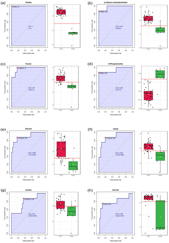 Generally, the VIP scores from the OPLS-DA model with high accuracy and predictability (R2 and Q2 values) were utilized as a basis for the selection of biomarkers. However, the model was found to lack transparency and was insufficient for selecting biomarkers [30]. Therefore, we employed receiver operating characteristic (ROC) curve analysis to discover biomarkers among the significant differential metabolites. The areas under the ROC curves (AUCs) were used to determine the effectiveness of potential metabolites. According to Xia et al. [30], AUC values can be interpreted as follows: 0.9–1.0 = excellent; 0.8–0.9 = good; 0.7–0.8 = fair; 0.6–0.7 = poor; 0.5–0.6 = fail. Our AUC analysis (Figure 5) revealed that only one metabolite, choline, had an AUC value of 1. Choline has been revealed as a potential biomarker in earlier studies for distinguishing milk from different dairy animals [15,31]. Three metabolites were found with AUC values of >0.9 (sn-glycero-3-phosphocholine, fucose and O-phosphocholine) and >0.8 (glucose, citrate and 2-oxoglutarate). Two metabolites (lactose and sucrose) had AUC values > 0.7. Hence, we can conclude that the eight metabolites with AUC values > 0.7 indicate strong discriminatory ability and potential utility as robust biomarkers for discriminating between CY and GY samples.
