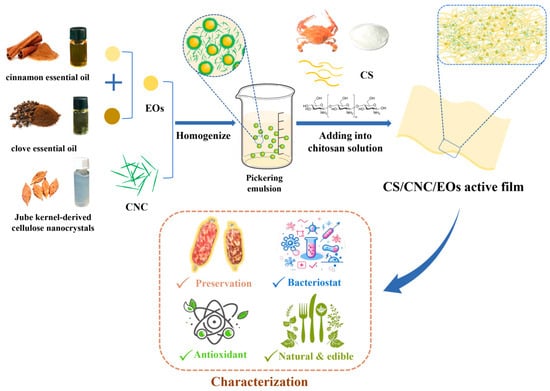 Disposable petroleum-based plastics are commonly used for preserving and packaging meat products due to their convenience and low production costs. However, these plastics have several drawbacks, including poor recyclability, being environmentally pollutive, and posing a risk of microplastic contamination [14]. To address these challenges, films based on various biopolymers, including chitosan (CS), cellulose derivatives, starch, and pectin, have been developed [15,16]. These bio-based films can serve as carriers for biodegradable and bioactive compounds, extending the shelf life of food items and preventing environmental pollution. CS, a positively charged polysaccharide derived from chitin through alkaline N-deacetylation, is commonly used in the preparation of thin films due to its excellent film-forming abilities, antimicrobial properties, and biocompatibility [17]. To enhance the functionality of CS-based films, natural antimicrobials and metal nanoparticles have been incorporated into the CS matrix [18,19]. In particular, plant EOs have proven effective in improving both antimicrobial and antioxidant activities and water resistance in bio-based films. In turn, the incorporation of plant EOs into bio-based films can reduce their volatility [20]. However, EOs are often insoluble in the matrices of hydrophilic or acidic membranes, can aggregate on the membrane’s surface, and can be deactivated during membrane drying and storage. These challenges limit the applications of EOs in bio-based food-packaging membranes. However, to solve this problem, EOs can be formulated into oil-in-water (O/W) Pickering emulsions. This approach improves the adhesion of EOs within the film matrix and regulates their release rate [21]. Unlike conventional emulsions, Pickering emulsions use solid particles as stabilizers to enhance the stability of the O/W mixture. These solid particles settle at the interface between the oil and water phases, stabilizing oil droplets through electrostatic and steric mechanisms [22]. Pickering emulsions also offer long-term stability and prevent agglomeration, enhancing the overall functionality of bio-based films [23]. Colloidal particles from various polymers, including natural proteins and polysaccharides, can be used to generate Pickering emulsions. Among these, cellulose nanocrystals (CNC) are particularly effective as stabilizers [24,25].