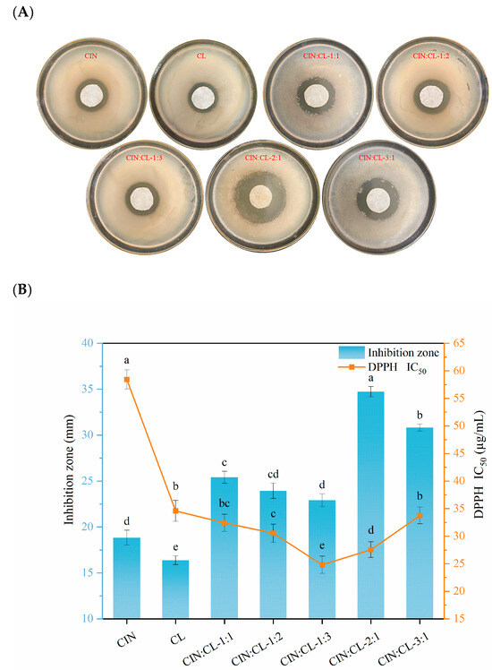 (A) Digital photographs showing the antibacterial effect of composites containing different ratios of essential oils. (B) Inhibition zone and DPPH IC50 value of composites containing different ratios of essential oils. Different letters indicate significant differences (p < 0.05).