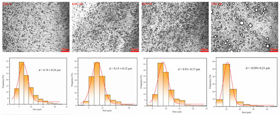 The optical microscopy images and particle size distributions of Pickering emulsions prepared using different EOs (CIN:CL = 2:1) concentrations are shown in Figure 3. Notably, the Pickering emulsions contained nearly spherical droplets, and the droplet size was uniform.