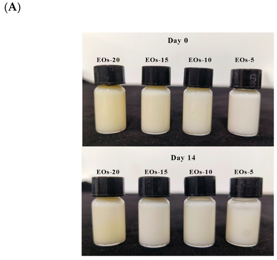 Particle size distribution is an important parameter affecting the stability of Pickering emulsions [49]. In this study, the particle size range of EOs Pickering emulsions was 6.74–10.89 μm. The particle size distribution exhibited a single peak mode, and the observed particle size was consistent with previous reports [39,50]. As the proportion of EOs increased from 5% to 20%, the particle size of the emulsion increased significantly, likely because of stronger binding between the stabilizer (CNC) and the surfaces of the oil droplets [26]. All the prepared Pickering emulsions remained stable and homogeneous, without showing phase separation or droplet merging, throughout 1 month of storage. Nevertheless, the emulsions showed gradual yellowing during this period due to the presence of EOs (Figure 4A).