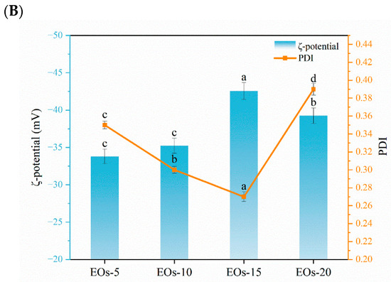(A) Digital photographs of EOs Pickering emulsions after 0 and 14 days; (B) PDI and ζ-potential of Pickering emulsions with different concentrations of EOs. Different letters indicate significant differences (p < 0.05).