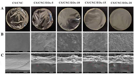 (A) Photographs of CS/CNC/EOs films obtained using a digital camera; (B) SEM images showing the surfaces of CS/CNC/EOs films; (C) SEM images showing the cross-sections of CS/CNC/EOs films.