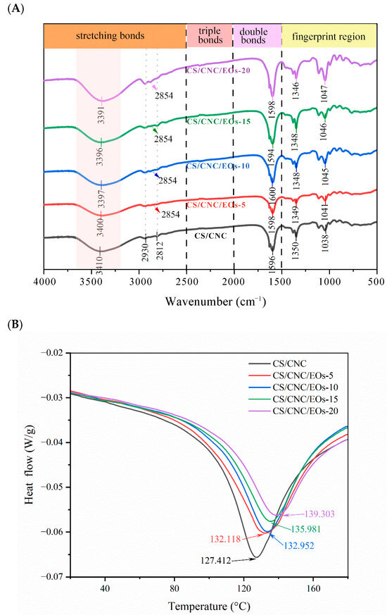 FTIR was used to characterize the changes in the chemical bonds and functional groups of the packaging films at the molecular level. When major functional groups interact with each other or other functional groups, their vibrational and spectral positions change [64]. Figure 6A shows the infrared spectra of Pickering emulsion composite films containing different concentrations of EOs. The characteristic spectra of CH3, CH2, and CH tensile and bending vibrations were observed at 2930 cm−1 and 2812 cm−1. The prominent peak observed at 3413 cm−1 was indicative of CS and could be attributed to the simultaneous stretching vibrations of O-H and N-H in that specific spectral region. The addition of EOs Pickering emulsions not only widened the peak at 3413 cm−1 but also shifted this peak toward a low wave number. This indicated that hydrogen bonds were formed between the CS and the EOs Pickering emulsions [65], reducing the number of free hydroxyl groups in the active film and decreasing peak strength [37]. After the introduction of EOs Pickering emulsions, a new peak appeared near 2854 cm−1. This peak was attributed to the C-H tensile vibrations in EOs Pickering emulsions and became stronger as the content of the emulsion increased. The absorption peak at 1596 cm−1 corresponded to the -NH bending vibration. As the concentration of EOs in the Pickering emulsions increased, the absorption peak shifted toward a higher value. The change in the absorption peak was ascribed to the stretching vibration of the C=C bond in the aromatic rings present in the molecular constituents of the EOs Pickering emulsions [66]. Further, the CS neutralization process transformed the -NH3+ groups in the membrane into unbound amine groups [67]. As the amount of EOs added to the EOs Pickering emulsions increased, the absorption peak at 1346 cm−1 shifted toward the right due to C-N tensile vibrations. The decreased strength of these absorption peaks could be due to interaction (hydrogen bonding) between the -NH or -COOH groups of CS and the -OH groups of EOs Pickering emulsions. The absorption peak at 1038–1048 cm−1 corresponded to the ether-group C-O tensile vibrations in CS [68].