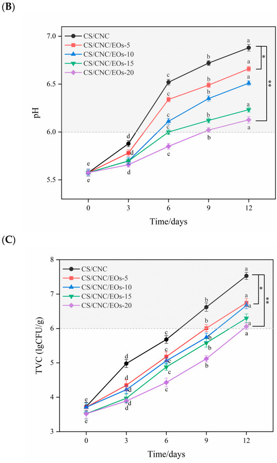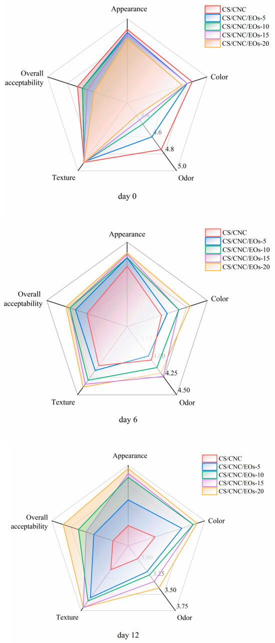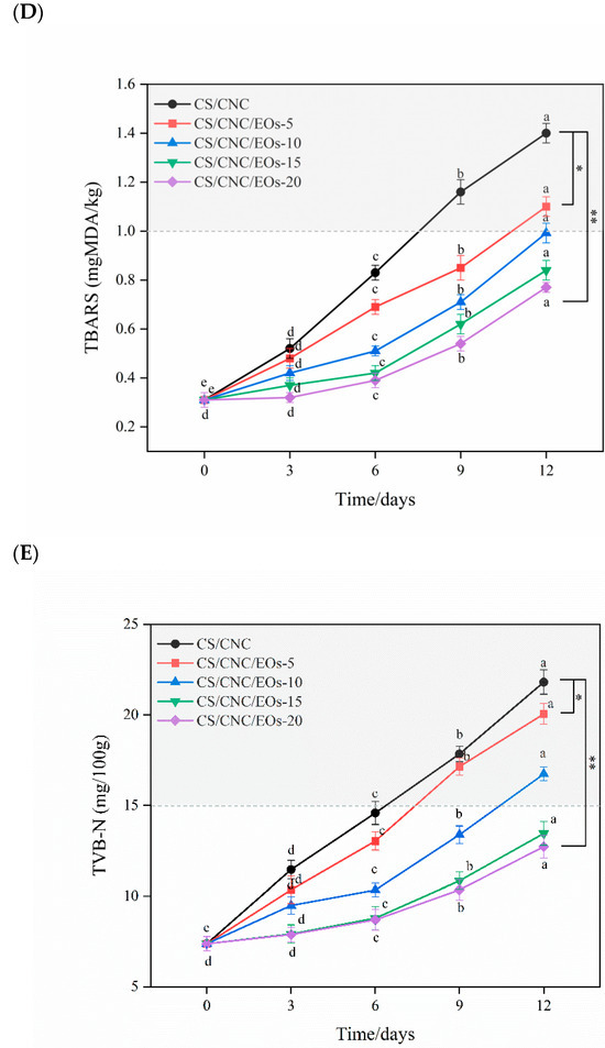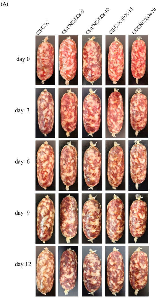 As shown in Figure 7A, the ability of the films to retain the freshness of foods was evaluated using sausage samples. The sausages were stored at 4 °C for 12 days. Initially, on day 0, all the sausages were the same color, indicating that the films containing EOs had no adverse effect on their color. Notably, the sausages showed varying degrees of deterioration by day 9. However, the sausages treated with the CS/CNC/EOs-20 film showed the slowest rate of deterioration. On day 12, the extent of color deterioration was significantly less in the sausages treated with the CS/CNC/EOs film than in those treated with the CS/CNC film. This can be attributed to the antimicrobial effect of the EOs in the film, which inhibited microbial growth, and their antioxidant capacity, which effectively slowed down the spoilage of the sausages.