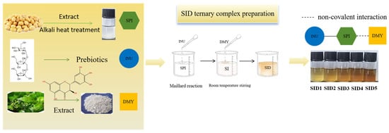 DMY solutions were prepared by dissolving DMY in 100 mL of deionized water to produce polyphenol solutions with concentrations of 1 mg/mL to 5 mg/mL, stirring at 80 °C for 1 h at 300 rpm, and adjusting the pH to 7. Equal volumes were added to the dispersion of soybean protein isolate/inulin (SI) and agitated for 3 h at 25 °C. The obtained suspensions were freeze-dried in a vacuum at −50 °C for 48 h (CHRIST ALPHA1-2 Vacuum Freeze-Dryer, Marin Christ, Osterode am Harz, Germany). Finally, the ternary complex solutions were formed with a dihydromyricetin concentration of 0.5 mg/mL to 2.5 mg/mL (marked as SID1~SID5). Figure 1 shows the preparation of the complex.