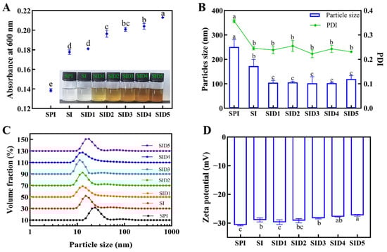 Turbidity (A), particle size, PDI (B), volume distribution (C), and zeta potential (D) of SPI, SPI-INU (SI) binary complex, and SPI-INU-DMY (SID) ternary complexes at different DMY concentrations. Different lowercase letters (a–e) indicate significant differences (p < 0.05).