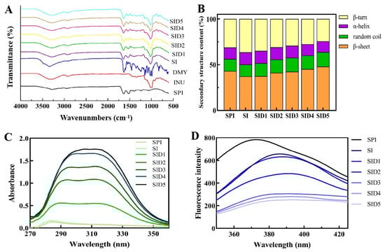 FTIR spectra (A), secondary structure (B), ultraviolet absorption spectra (C), and fluorescence spectra (D) of SPI, SPI-INU (SI) binary complex, and SPI-INU-DMY (SID) ternary complexes at different DMY concentrations.