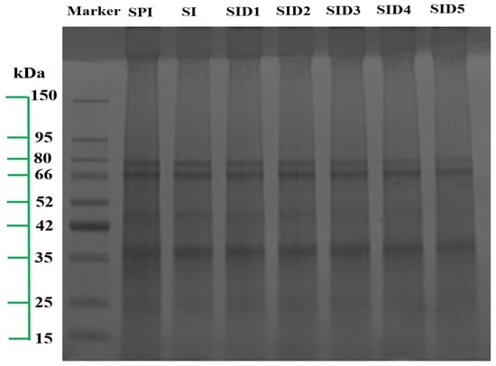 SPI is a mixture of proteins that may be divided by centrifugal force into 2S, 7S, 11S, and 15S fractions [41]. Figure 4 shows the SDS-PAGE gel of all samples. After adding INU, the protein bands did not show obvious changes. However, the bands appeared lighter, indicating that the subunit participated in the Maillard reaction between SPI and inulin [56]. The addition of DMY did not create any new bands, which means that there is no covalent reaction between DMY with SPI/INU [57]. The results are similar to non-covalently linked SPI/anthocyanin complexes [41]. The bands of the coconut globulin/coffee polyphenol (CG-CP) complex are the same as those of CG, and there are no obvious new bands. This suggests that the CG-CP complex is formed by non-covalent interactions [58]. There is a slight fading of the SID4 and SID5 bands, especially for SID5. This may be because high-concentration DMY causes protein aggregation and forms partially insoluble aggregates [59].