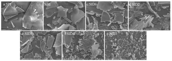 SEM was used for observing the microstructure of all samples, as can be seen in Figure 5. SPI had a larger lamellar structure. Adding INU ruined the big sheet construction of SPI. The SID complexes are smaller fragments with uniform and compact structures [55]. When DMY was added, it exposed the protein’s internal hydrophobic groups. This reduced the aggregation of the complexes. When hydrophobic groups were exposed and interacted, they restricted the movement of molecules to aggregate, thus maintaining a stable structure [60]. Similarly, when EGCG formed a ternary complex with soybean isolate protein/soybean polysaccharide, the ternary complex had a smaller lamellar structure [61].