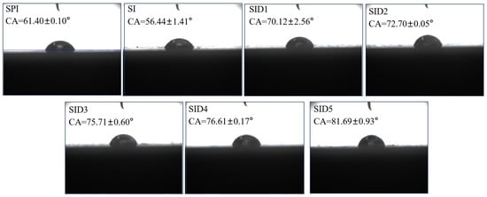 In the food industry, Pickering emulsions can be used in applications such as loading and delivering bioactive substances, food packaging, and fat substitutes. However, during the processes of production, storage, transportation, and application, emulsions are likely to encounter diverse instability issues, including stratification, creaming, flocculation, and aggregation. These problems will affect the product’s storage life and sensory properties. The capacity of the particles to stabilize the emulsion depends largely on their wettability. The three-phase contact angle (θ) is frequently applied to determine wettability. Particles with θ > 90° were classified as lipophilic, whereas those with θ < 90° were classified as hydrophilic. Particles with a three-phase contact angle near 90° have an excellent performance in stabilizing the water–oil interface due to better amphiphilicity [23]. As shown in Figure 6, the three-phase contact angle of the SID complexes increased compared to SPI and SI. At 2.5 mg/mL DMY, the three-phase contact angle reached 81.69°. When DMY was added to the SI complex, the complex contact angle slowly approached 90°. This shows that complexes may better adhere at the oil–water interface to stabilize emulsions. DMY unfolded the SPI structure, exposing the interior hydrophobic groups and increasing hydrophobicity [58]. Also, the literature shows that the contact angle of DMY is 118.8°, suggesting that DMY exhibits hydrophobicity [20]. In contrast, the three-phase contact angle of SPI is 61.40°, which is hydrophilic. Thus, the wettability of the particles can be altered by adjusting the DMY concentration. When epigallocatechin-3-gallate (EGCG) was added to sea bass protein, the contact angle of the complex finally reached 78.7°, showing a better performance for the stabilization of the emulsion [36]. The contact angle of the soy protein/β-glucan/coumarin complex changed to 92.6° when coumarin was added, which shows an improvement in emulsifying properties [1]. DMY can improve the wettability of the SI complex and thus enhance its emulsifying properties.