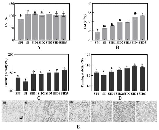 Emulsifiability (A,B), foamability (C,D), and emulsion micrograph (E) of SPI, SPI-INU (SI) binary complex, and SPI-INU-DMY (SID) ternary complexes at different DMY concentrations. Different lowercase letters (a–c) indicate significant differences (p < 0.05).