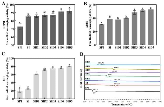DPPH, ABTS, OH radical scavenging ability (A–C), and DSC (D) of SPI, SPI-INU (SI) binary complex, and SPI-INU-DMY (SID) ternary complexes at different DMY concentrations. Different lowercase letters (a–c) indicate significant differences (p < 0.05).