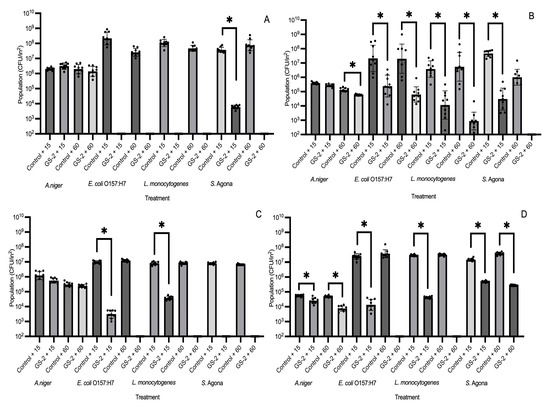 Population changes (CFU/in2) of A. niger, E. coli O157:H7, L. monocytogenes, and S. enterica Agona (S. Agona) on 3% GS-2 treated or non-treated (control) acrylonitrile butadiene styrene (A), cardboard (B), high-density polyethylene (C), and polypropylene (D) coupons after 15 or 60 min of exposure time. Limit of detection is 2 log CFU/in2. Values are presented as mean ± standard deviation. Asterisks (*) represent significant differences between treatments (control + 15 vs. GS-2 + 15 or control + 60 vs. GS-2 + 60) within A. niger or bacterial strains.