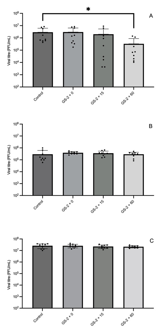 To determine the efficacy of GS-2 against MNV and the most optimal GS-2 exposure time, cardboard and two different plastic coupons (ABS and PP) were first treated with 3% GS-2, before drying in a biosafety cabinet for 60 min, then inoculated with MNV. After an exposure time of 0 min, 15 min, or 60 min, viral titers were quantified via plaque-forming assay. GS-2 was more effective against MNV on ABS coupons compared to cardboard and PP coupons. On ABS coupons, when MNV was exposed to GS-2 for 60 min, MNV titers were significantly reduced by 1 log PFU/mL compared to the control (p < 0.05, Figure 2A). In contrast, an exposure time of 15 min and 0 min were not significantly different compared to the control (p > 0.05, Figure 2A). On cardboard and PP coupons, regardless of the exposure time (0, 15, or 60 min), there was no significant reduction in MNV titers after GS-2 treatment (p > 0.05, Figure 2B,C).
