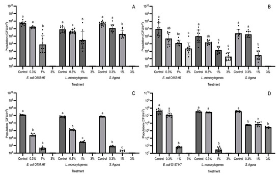 Population changes (CFU/in2) of E. coli O157:H7, L. monocytogenes, and S. enterica Agona on GS-2-treated coupons at concentrations 0.3%, 1%, and 3% or with no GS-2 (control). Four coupons included acrylonitrile butadiene styrene (A), cardboard (B), high-density polyethylene (C), and polypropylene (D). Limit of detection is 2 log CFU/in2. Values are presented as mean ± standard deviation. Different superscripts (a–c) represent significant differences between treatments within bacterial strain.