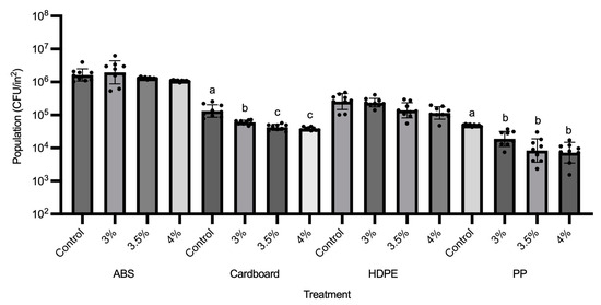 Plastic materials of acrylonitrile butadiene styrene (ABS), high-density polyethylene (HDPE), polypropylene (PP), and cardboard boxes from a local company were used in this study to represent common food packaging materials for the storage and transport of fresh produce. ABS, HDPE, PP, and cardboard were cut into 1 × 1-inch coupons, sanitized with 70% ethanol, and separated into control and treatment groups. For the treatment group, stock solutions of GS-2 (Wintermute Biomedical, Ten Carbon Chemistry, Scoresby, Victoria, Australia) were diluted with sdH2O to a concentration of 3%. After dilution, 0.1 mL of 3% GS-2 was pipetted onto the coupons of each plastic and cardboard coupon individually, spread with a plastic spreader, and then dried in a biosafety cabinet for 60 min. The plastic and cardboard coupons in both the control and treatment groups were then spot inoculated individually with 0.1 mL of A. niger, E. coli O157:H7, L. monocytogenes, or S. enterica Agona and then spread with a plastic spreader. The resulting inoculations were ~107 CFU/mL for A. niger and ~109 CFU/mL for the bacteria. After 15 min and 60 min, the plastic and cardboard coupons were placed in a sterile Whirlpak bag filled with 5 mL BPB and stomached for 1 min at 150 rpm for viable cell recovery. Serial dilutions in BPB were performed and plated on BHIArif for bacterial strains and PDA was for A. niger, respectively. E. coli O157:H7 and S. enterica Agona plates were incubated at 37 °C for 24 h and A. niger and L. monocytogenes plates were incubated for 48 h at 37 °C prior to viable cell enumeration.