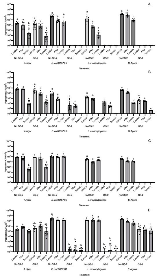 Coupons were first inoculated with 3% GS-2 and then inoculated with A. niger, E. coli O157:H7, L. monocytogenes, or S. enterica Agona separately. A grape tomato was placed on top of each coupon and afterwards, A. niger and bacterial populations were enumerated on both coupons and tomato surfaces. On both ABS and HDPE coupons, GS-2 reduced E. coli O157:H7, L. monocytogenes, and S. enterica Agona populations to below the detection limit. For this reason, bacterial populations on the grape tomato and on the coupons were both below the detection limit (Figure 5A,C). On PP coupons, there were no significant differences between E. coli O157:H7, L. monocytogenes, and S. enterica Agona populations inoculated on the coupon (control), after transfer to grape tomato (After), and transferred onto grape tomato (Tomato) (p > 0.05, Figure 5D), but were significantly decreased compared to no GS-2 by ~5–5.8 log CFU/in2 for E. coli O157:H7 and L. monocytogenes and ~1.7–2 log CFU/in2 for S. enterica Agona (p < 0.05, Figure 5D). On cardboard coupons, there was a lower reduction in bacterial populations after GS-2 treatment compared to ABS, HDPE, and PP coupons as E. coli O157:H7, L. monocytogenes, and S. enterica Agona populations were significantly reduced by ~1.2–2.2 log CFU/in2, ~1 log CFU/in2, and ~1.5–2 log CFU/in2, respectively (p < 0.05, Figure 5B). For A. niger, there is limited effectiveness from GS-2 treatment compared to bacteria. After GS-2 treatment, there were no significant differences between the no-GS-2 and GS-2 treatments (p > 0.05, Figure 3A–D).