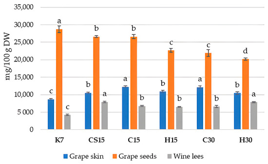 The total concentration of phenols detected by HPLC ranged from 533.80 mg/100 g of dry weight (DW) in the control treatment (K7) to 978.54 mg/100 g DW in treatment with pre-fermentative cooling, the saignée procedure, and 15-day maceration (CS15). The saignée procedure, which involves the removal of a portion of the must prior to the onset of fermentation, effectively increases the solid (i.e., skins plus seeds)-to-pulp ratio [39]. The total concentration of phenolic compounds in grape skin samples in all the treatments was significantly higher compared to the control (K7), as noted in a previous paper [29] which reported the phenolic profile of wines from which these by-products originated. The treatments where pre-fermentative hot maceration was applied (H15 and H30) showed the most elevated concentrations in the corresponding wines [29] as a result of a more intense extraction of phenolic compounds from the skins into the liquid phase supported by heat. Consequently, such an exhaustion of pomace led to a lower concentration of phenolic compounds in grape skin samples of these treatments in this study (H15 and H30), when compared to the other three treatments, that is, CS15, C15, and C30 (Table 2).