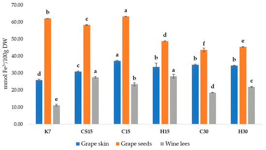 In PCA plots which showed the separation of grape skins and wine lees samples (Figure 4 and Figure 5), the control treatment (K7) was distinctly differentiated from the others, mostly along PC1 but also along PC2, thus indicating the weakest correlation of the control K7 treatment with the quantities of all the analyzed compounds and features among the treatments. These results align with the results of the one-way ANOVA reported in Table 2 and Table 3 and Figure 1, Figure 2 and Figure 3, since the samples from the K7 treatment exhibited the lowest concentration of the majority of detected phenolic compounds, as well as the lowest value of the TPC and antioxidant activity.