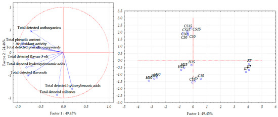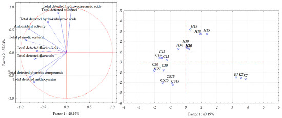 Separation of Teran grape skin samples obtained after application of pre-fermentative and post-fermentative vinification technologies presented in three replications in two-dimensional space defined by the first two principal components (PC1 and PC2) based on the concentrations of bioactive phenolic compounds and antioxidant activity. Treatments: control—standard 7-day maceration (K7); pre-fermentative cryomaceration (8 °C, 48 h) followed by a 13-day (C15) and 28-day (C30) period of simultaneous fermentation/maceration and extended post-fermentative maceration; pre-fermentative cryomaceration (8 °C, 48 h) followed by saignée procedure, and 13-day period of simultaneous fermentation/maceration and extended post-fermentative maceration (CS15); pre-fermentative hot maceration at (50 °C, 48-h) followed by a 13-day (H15) and 28-day (H30) period of simultaneous fermentation/maceration and extended post-fermentative maceration.