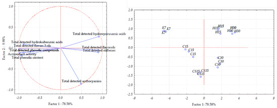 Furthermore, regarding grape seed samples (Figure 5), total detected phenolic compounds, hydroxybenzoic acids, and flavan-3-ols determined by HPLC, total phenolic content, and antioxidant activity showed the strongest correlation with K7 and C15 treatments. These results were consistent with those obtained by the one-way ANOVA (Table 3, Figure 1, Figure 2 and Figure 3), emphasizing the strong effect of pre-fermentative and post-fermentative vinification technologies on the extraction of phenolic compounds from grape seeds to wine, which left the highest concentration of phenolic compounds retained in the seeds of the control treatment (K7). The PCA allowed a good separation of investigated seed samples along the first principal component, since treatments C15 and CS15 were clearly separated from C30, H15, and H30, which is also evident with the high percentage of the variance (PC1 78.58%). The former was correlated most with total detected hydroxybenzoic acids, flavan-3-ols, phenolic compounds, antioxidant activity, and total phenolic content, while the latter was mostly correlated with total detected hydroxycinnamic acids, flavonols, and stilbenes. The obtained results of the grape seed PCA analysis were in line with the results obtained for the Teran wine wherefrom these by-products originated, with the control wine being characterized by the significantly lowest concentrations of total detected hydroxybenzoic acids, flavan-3-ols, and the lowest total phenolic content and antioxidant activity [29], showing that the lesser extent of the extraction of mentioned compounds from grape seed was directly reflected to their content in wine samples.