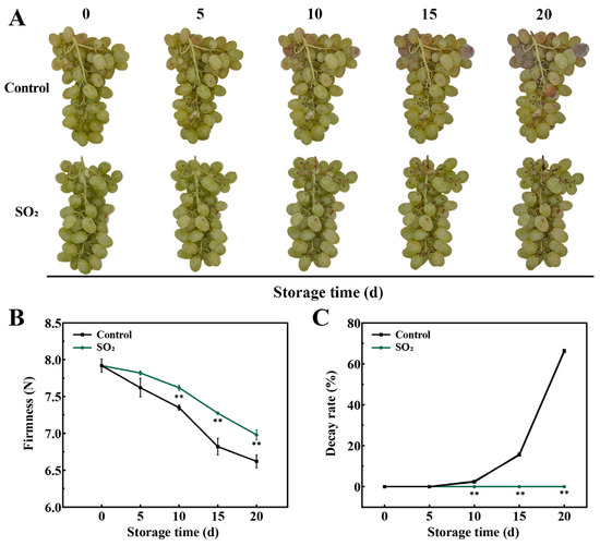 The SO2 treatment maintains the appearance and postharvest quality of ‘Munage’ table grapes during storage at 10 °C for 20 d. (A) Alterations in visual appearance of control and SO2-treated grapes. (B,C) Comparison of firmness and decay rate in ‘Munage’ grapes under control and SO2 treatment. The data in (B,C) represent the average plus or minus standard error of three biological replicates. Asterisks indicate statistical significance between control and SO2-treated grapes, with ** indicating p < 0.01.
