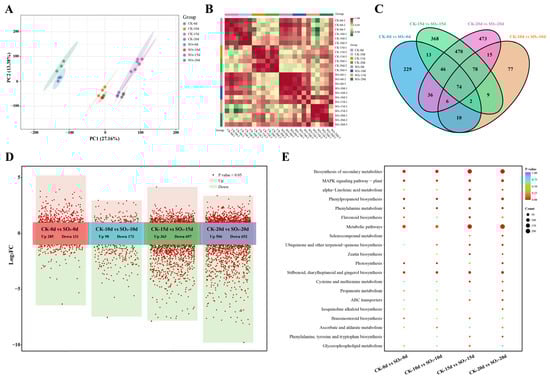 Overview of ‘Munage’ table grapes transcriptome with control and SO2 treatment. (A) PCA score plot profiles and (B) correlation heat map from transcriptomic data. (C) Venn diagram presenting the differentially expressed genes (DEGs) in CK-0d vs. SO2-0d, CK-10d vs. SO2-10d, CK-15d vs. SO2-15d, and CK-20d vs. SO2-20d comparisons. (D) Volcano plots of up-regulated and down-regulated genes between control and SO2-treated group. (E) KEGG enrichment pathways of DEGs from different comparison groups.