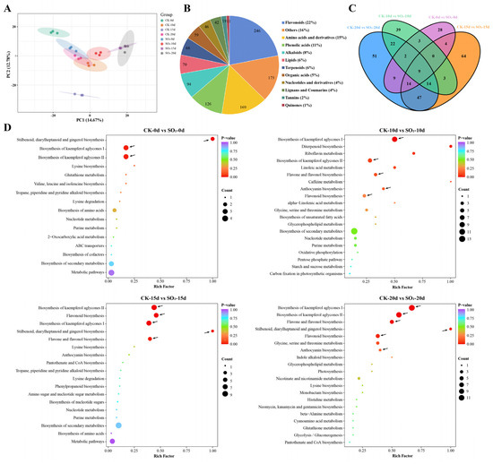 Overview of ‘Munage’ table grapes metabolome with control and SO2 treatment. (A) PCA of control and SO2-treated group from metabolomics data. (B) Statistics of the types and amounts of identified metabolites. (C) Venn diagram presenting the differentially accumulated metabolites (DAMs) in the CK-0d vs. SO2-0d, CK-10d vs. SO2-10d, CK-15d vs. SO2-15d, and CK-20d vs. SO2-20d comparisons. (D) KEGG enrichment pathways of DAMs from different comparison groups.