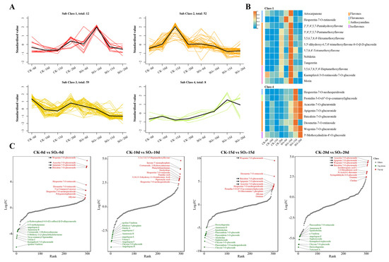 Analysis of DAMs associated with SO2 maintaining grape quality. (A) k-means clustering analysis of differentially accumulated flavonoid metabolites. (B) Heat map of the DAMs in class 1 and class 4. (C) Up-regulated and down-regulated DAMs in different comparison group (TOP10).