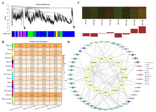 To construct gene regulatory networks for key metabolites, 16,051 genes (FPKM > 1) were entered into the WGCNA analysis, identifying fifteen modules, with the module sizes from 48 (cyan) to 5046 (turquoise) (Figure 6A). In the module–trait relationships, the brown module showed the highest positive correlations with the relative content of key metabolites (Wogonin-7-O-glucuronide, Acacetin-7-O-glucuronide, Apigenin-7-O-glucuronide, and Baicalein-7-O-glucuronide) (r > 0.75, 0 < p < 0.03) (Figure 6B). Heatmaps and eigengene histograms revealed that the gene expressions from the brown module were up-regulated by SO2 treatment (Figure 6C), especially on days 15 and 20, aligning with the accumulation pattern of the target metabolites. These results indicate that the brown module is closely associated with key metabolites and can be considered a critical module for further analysis.