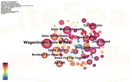 The network of institutional collaborations in research fields relevant to plant-based meat is depicted in Figure 3. The top three most prolific scientific institutions among them are Wageningen University & Research in the Netherlands (24 publications), the University of Bath in the UK (18 publications), and Ghent University in Belgium (14 publications). The collaboration network of research institutions in Figure 3 reveals that studies on plant-based meat remain in the nascent phase of exploration, as evidenced by Wageningen University & Research, which, despite having the highest publication count, has only 24 relevant studies in this domain. The analysis of the pertinent cooperation network metrics (N = 210, E = 256, density = 0.0117) indicates that the interconnections among diverse research institutes require further enhancement.