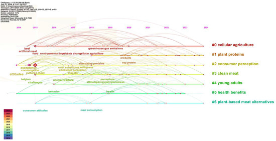 The cluster analysis of linked studies indicates that the most active areas of study were compiled. The node type selected was Cited Reference. The term or document that had the highest frequency each year, accounting for 50% of the total, was chosen as one of the Top N and referred to as the Top 50. Simultaneously, the time interval was adjusted to 1 year for each segment. The data contain the names of the main groupings, which include clean meat, formulation, consumer acceptability, meat alternatives, alternative proteins, healthy eating, and food neophobia. The findings are presented in Figure 4. The graph’s goodness of fit was satisfactory, as evidenced by the data presented in Figure 4 (N = 210, E = 256, Density = 0.0117, Modularity Q = 0.8432 (>0.3), Mean Silhouette = 0.9424 (>0.4)). The Modularity Q measure determined whether the graph could be divided into clusters, whereas the Mean Silhouette measure determined the strength of the connections between documents inside each cluster. It is not difficult to determine from the cluster analysis that customer acceptance is a crucial area for further study in the market for plant-based meat (Cluster #3). Researchers are also focusing on some plant meat production technologies and production safety factors because plant meat products are emerging foods that differ from traditional meat foods (cluster #0, 1, 2, 6, 8).