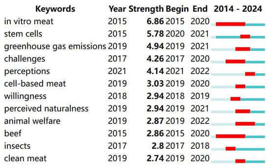 A time graph, which is constructed on the basis of keywords and their burst values, can effectively illustrate the research development pattern of the literature. To specify time parameters in CiteSpace, the node type is chosen, the TOP N value is set to 50, and the time slice is set to 1. Figure 5 displays the time graph for the keyword. Simultaneously, the study revealed that 10 out of the 12 most significant terms originated after the year 2020. Research on plant-based meat products has gained significant attention in recent years. Research trends in plant-based meat products encompass the exploration of technology, problems, and studies connected to consumption (refer to Figure 6).