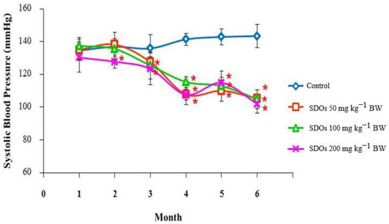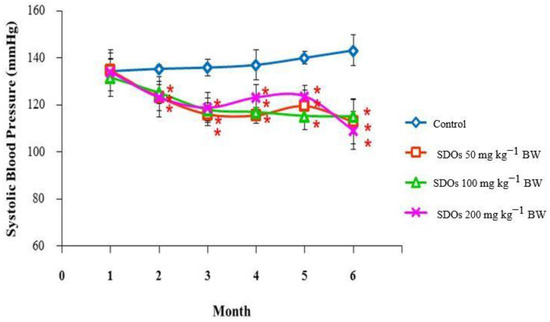 Comparison of the systolic blood pressure of control male Wistar rats with those receiving different doses of SDOs for 6 months. Values are expressed as mean ± SD. * p < 0.05; six rats per group.