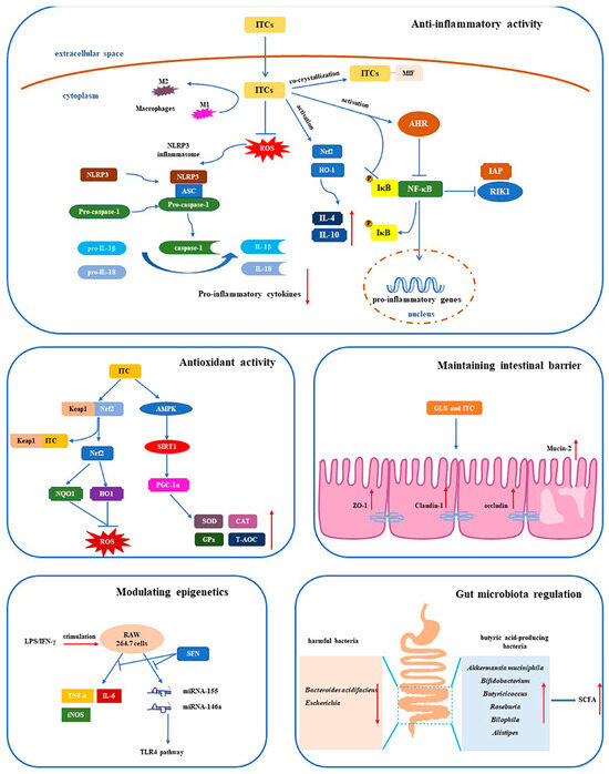 GLSs and their metabolites have no direct antioxidant activity, but they can induce cell-protective enzymes, including various antioxidant enzymes, to exert indirect antioxidant effects [71]. SFN attenuates LPS-induced oxidative stress in Caco2 cells through improving the levels of superoxide dismutase, glutathione peroxidase, catalase and total antioxidative capacity, and it activates the AMPK/ SIRT1/PGC-1α pathway, which helps control the levels of ROS in mitochondria [72]. Cedrowski et al. found that SFN and erucin thermally decompose into sulfenic acids and methylsul finyl radicals, thus exhibiting antioxidant activity at high temperatures above 100 °C [73]. SFN strongly activates transcription factor EB (TFEB) to promote autophagic flux and lysosomal biogenesis, relieving oxidative stress [74].