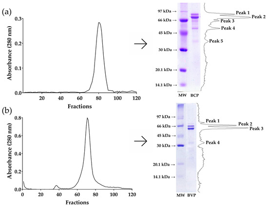 In Figure 1a, the size exclusion chromatography profile of the isolated β-conglycinin from soybean indicates the presence of one peak. The SDS-PAGE of that peak shows five bands (75.4 kDa, 68.6 kDa, 62.8 kDa, 52.3 kDa, and 37.9 kDa), as confirmed by the densitometric analysis. In Figure 1b, the size exclusion chromatography profile of the isolated β-vignin from cowpea bean indicates the presence of one peak. The SDS-PAGE of that peak shows four bands (69.6 kDa, 63.6 kDa, 58.4 kDa, and 37.7 kDa), as confirmed by the densitometric analysis.