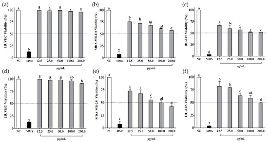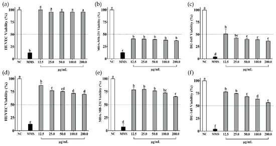 Cell viability (%) of (a) HUVEC, (b) MDA-MB-231, and (c) DU-145 cells when treated with β-vignin hydrolysate from cowpea bean. Cell viability (%) of (d) HUVEC, (e) MDA-MB-231, and (f) DU-145 cells when treated with peptides < 3 kDa from β-vignin hydrolysate from cowpea bean. NC: negative control—cells not treated. MMS: methyl methane sulfonate at 300 µM (positive control). Data are presented as mean ± standard deviation (n = 3). Different letters indicate differences between treatments (p-value < 0.05 according to Tukey’s multiple-range test).