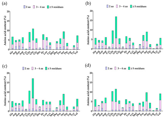 Amino acid content (%) of peptides from soybean β-conglycinin (a) β subunit, (b) α subunit, (c) α’ subunit, and (d) cowpea β-vignin from in silico hydrolysis.